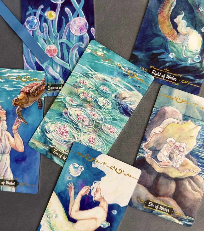 《 Ocean From The Sky Tarot》中文称作天空之海塔罗牌,这副牌是越南艺术家Natsumi(Huỳnh Hương)的作品,她用细腻的水彩画风,把海洋的神秘与深邃完美地融入了每一张牌面。