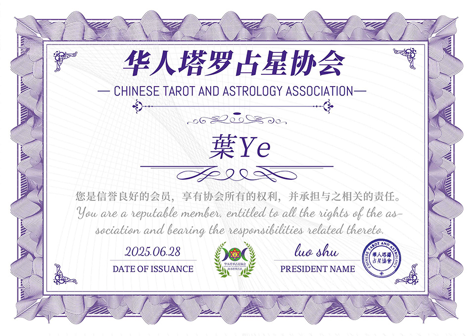 协会认证:华人塔罗占星协会认证 高阶塔罗导师
