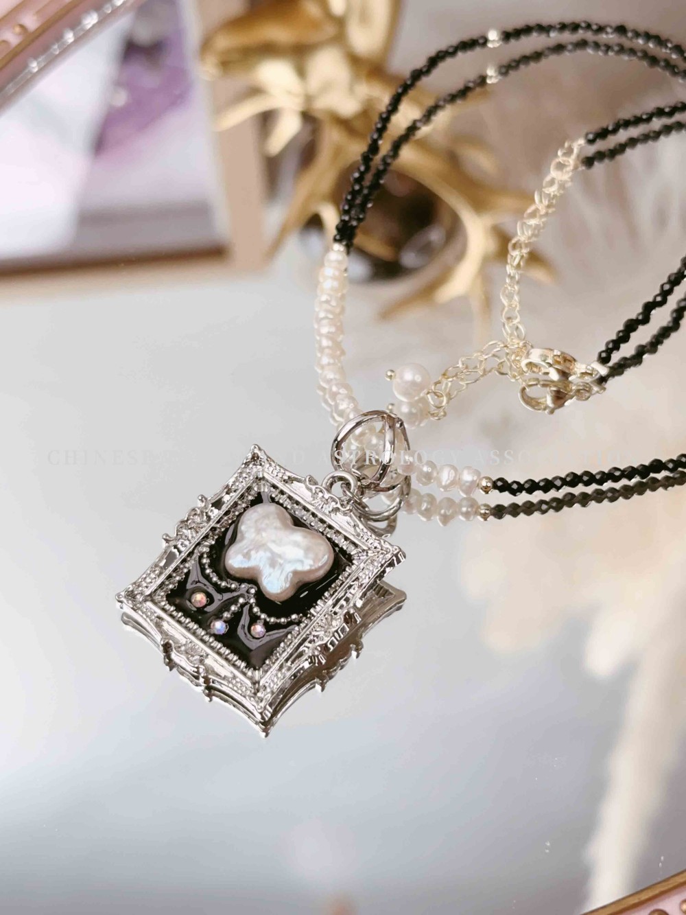 (珍珠蝴蝶坠 黑尖晶石珍珠细珠)项链